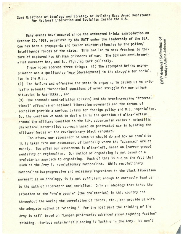 This collection highlights the Black Liberation Army (BLA), an underground Marxist-Leninist organization that operated in the United States from 1970-1981. BLA was primarily made up of former Black Panthers and Republic of New Afrika members. The organization's goal was to “take up arms for the liberation and self-determination of Black people in the United States” and they openly declared war on the United States government. Former Black Panther Party member and Jackson State University professor Frankye Adams-Johnson’s Black Panther Party Collection includes many items associated with the BLA such as newspaper clippings, BLA newsletters, drafts of speeches, position papers, and more. These materials offer a rare glimpse into the inner workings of this underground organization.