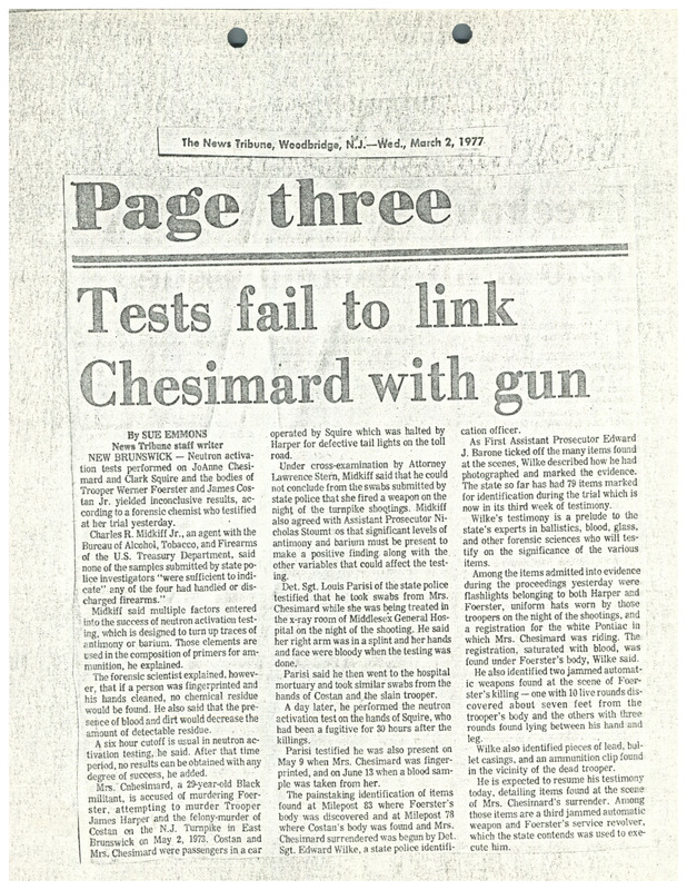 A newspaper article from The News Tribune about forensic tests performed on the bodies of the victims and defendants in the murder trial of Assata Shakur (JoAnne Chesimard) being inconclusive to show that the defendants held or shot the weapons in question. Shakur was on trial for the 1973 killing of a state trooper.