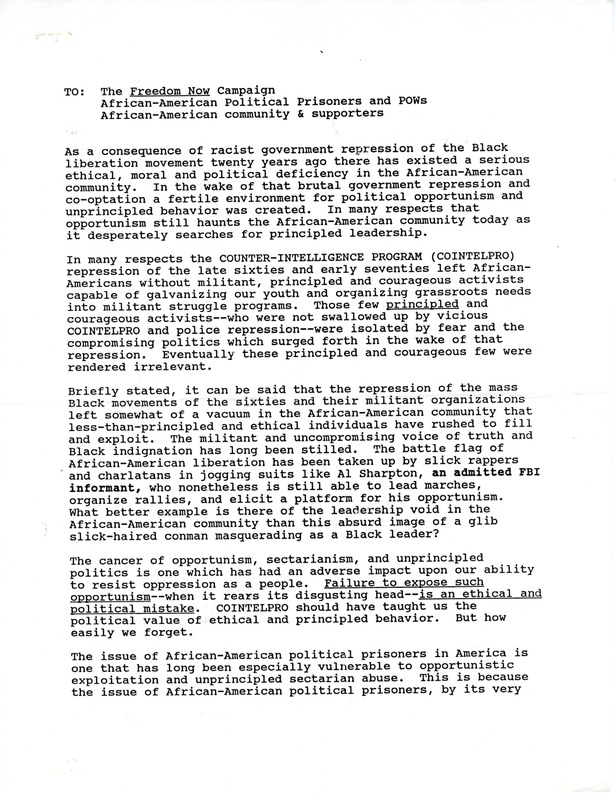 Black Panther Party leader, co-founder of the Black Liberation Army, and political prisoner Dhoruba Bin Wahd (Richard Moore) writes to the Freedom Now Campaign concerning several of the group's members exhibiting opportunistic tendencies on the issue of African-American political prisoners because of a power vacuum in the Black liberation struggle