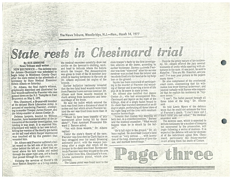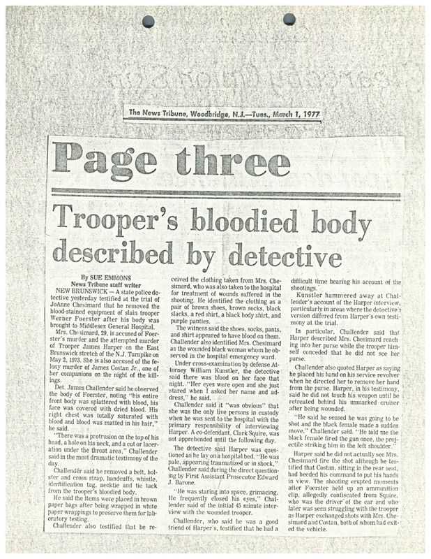 A newspaper article from The News Tribune about the testimony of State Police Detective James Challender describing what he saw at the emergency room where Assata Shakur (JoAnne Chesimard) and wounded state trooper Werner Foerster were taken after he was fatally shot. Shakur was on trial for the 1973 murder of Foerster.