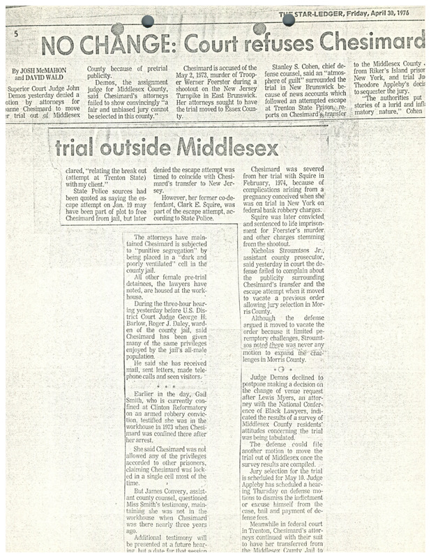 A newspaper article from The Star Ledger about Superior Court Judge John C. Demos denying a motion to move the murder trial of Assata Shakur (JoAnne Chesimard) for the 1973 killing of a state trooper out of Middlesex County because of the defense's inability to show that an unbiased jury couldn't be selected.