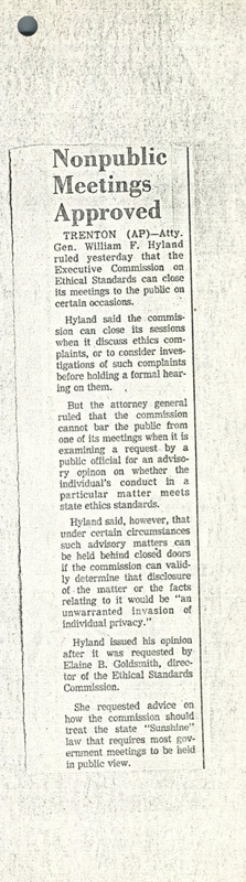 A newspaper article from the Asbury Park Press about Attorney General William F. Hyland ruling that the Executive Commission on Ethical Standards can close its meetings to the public on certain occasions. This article pertains to hearings in the trial of Assata Shakur (JoAnne Chesimard) for the 1973 killing of a state trooper.