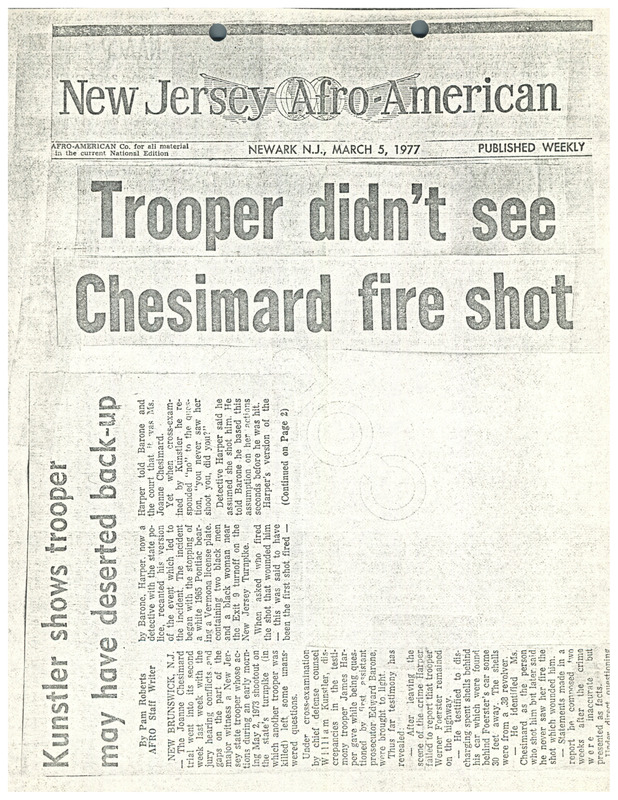 A newspaper from the New Jersey Afro-American about discrepancies in the testimony of trooper James Harper in the trial of Assata Shakur (JoAnne Chesimard) for the 1973 killing of a state trooper. In cross-examination, it was revealed that Harper had not seen Shakur fire the shot that had wounded him even though he had claimed that earlier.