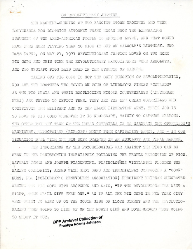 A short essay about the revolutionary killing of cops. The author gives two recent examples of revolutionaries killing cops, saying the killers are urban guerillas who constitute the military arm of the Black Liberation Army (BLA). The tagline of the essay is “All Power to the New Urban Guerilla, War to the End.”