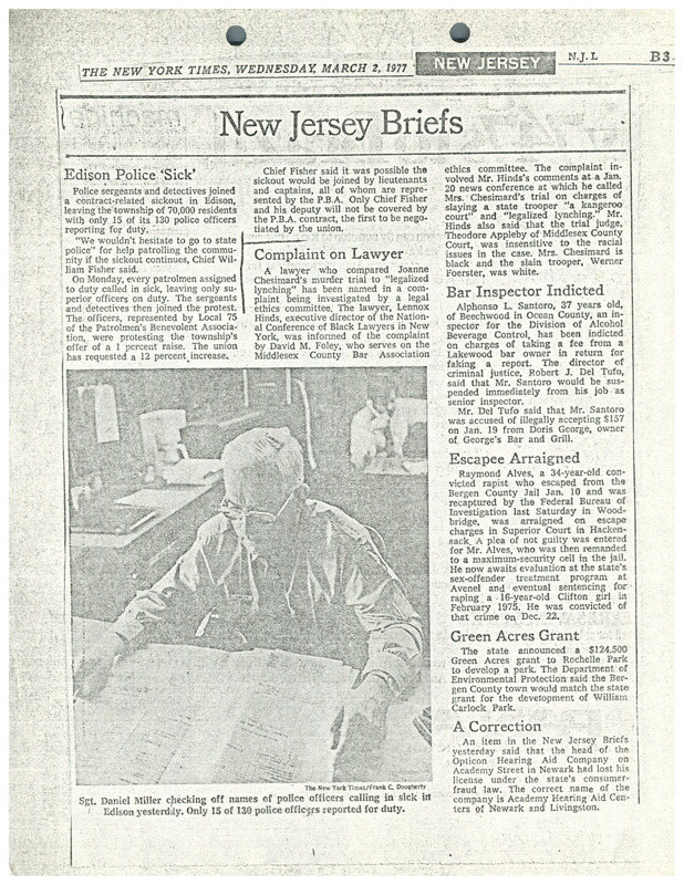 A newspaper article from The Star Ledger about District Court Judge George H. Barlow inspecting the cell where Assata Shakur (JoAnne Chesimard) is being held in Middlesex County to stand trial for the May 1973 killing of a state trooper. Shakur was convicted in 1977 of the killing and escaped prison in 1979.