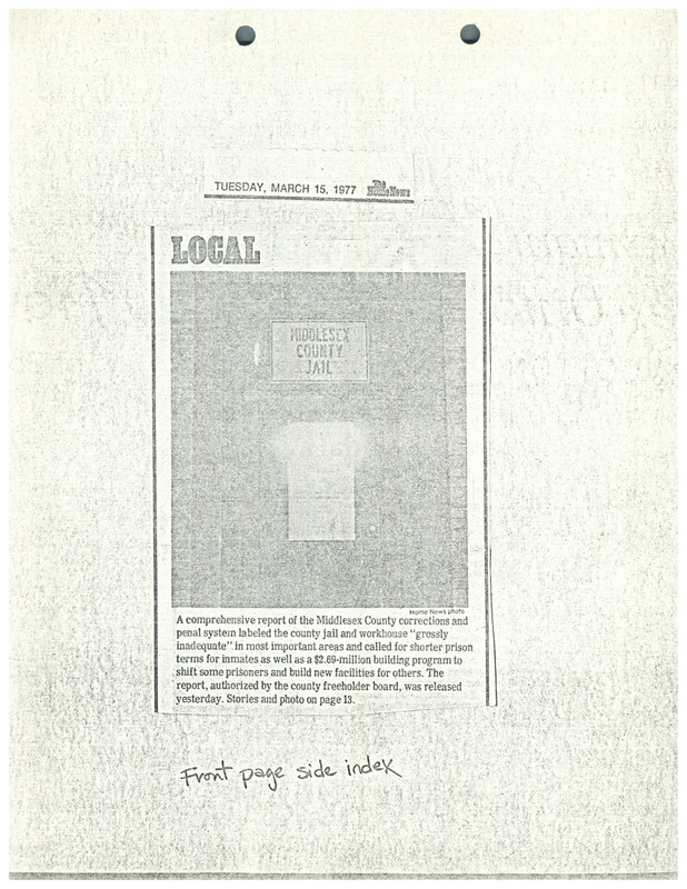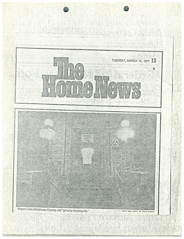 A photograph from the newspaper The Home News of Middlesex County Jail. The jail, where Assata Shakur (JoAnne Chesimard) was staying for her New Jersey trial for the 1973 killing of a state trooper, had been found "grossly inadequate" in a comprehensive report. The report called for shorter terms and millions of dollars in upgrades.