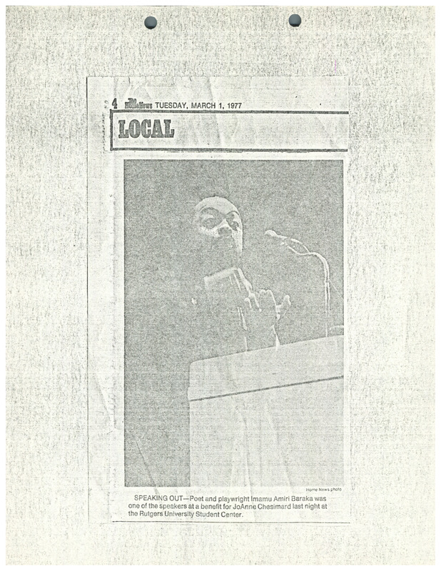 A photograph from the newspaper The Home News of poet and playwright Amiri Baraka speaking at a benefit for Assata Shakur (JoAnne Chesimard) at the Rutgers University Student Center in New Jersey. Shakur was on trial for the 1973 killing of a state trooper. Baraka was one of several speakers speaking on Shakur’s behalf at the benefit.