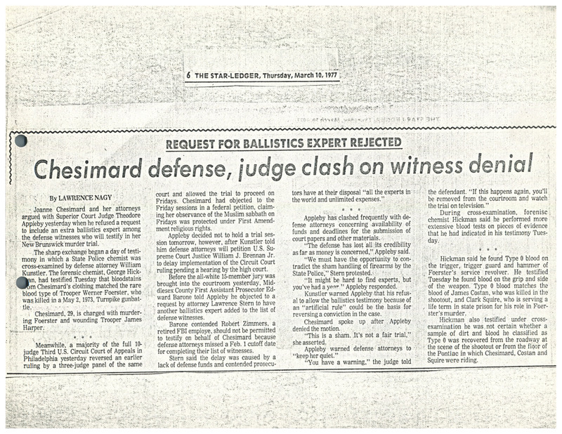 A newspaper article from The Star Ledger about the defense team for Assata Shakur (JoAnne Chesimard), on trial for the 1973 killing of a state trooper, being denied calling an extra ballistics witness by the judge. The prosecution contended the witness was not valid since the defense team missed the cutoff date to add witnesses to their list.