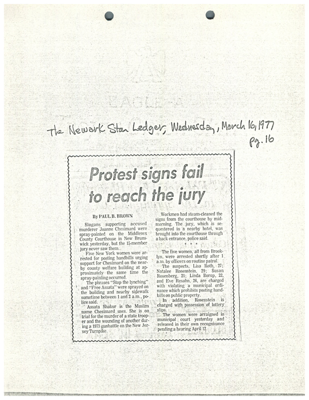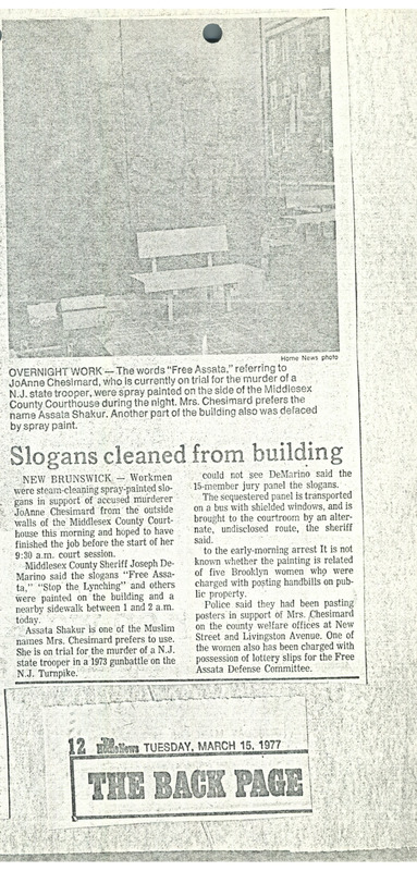 A newspaper article from The Star Ledger about slogans spray painted on the Middlesex County Courthouse in support of Assata Shakur (JoAnne Chesimard) during her trial trial for the 1973 killing of a state trooper. Five women were arrested for another incident where pro-Shakur handbills were posted on the nearby county welfare office.