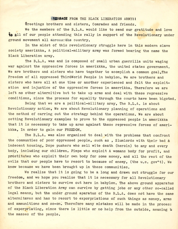 A message from the Black Liberation Army (BLA) to brothers and sisters, comrades and friends attending a rally. The message briefly outlines the history and tenets of the organization, including taking up arms against the oppressive government as well as combatting ills in the community such as slumlords, drug pushers, and pimps.