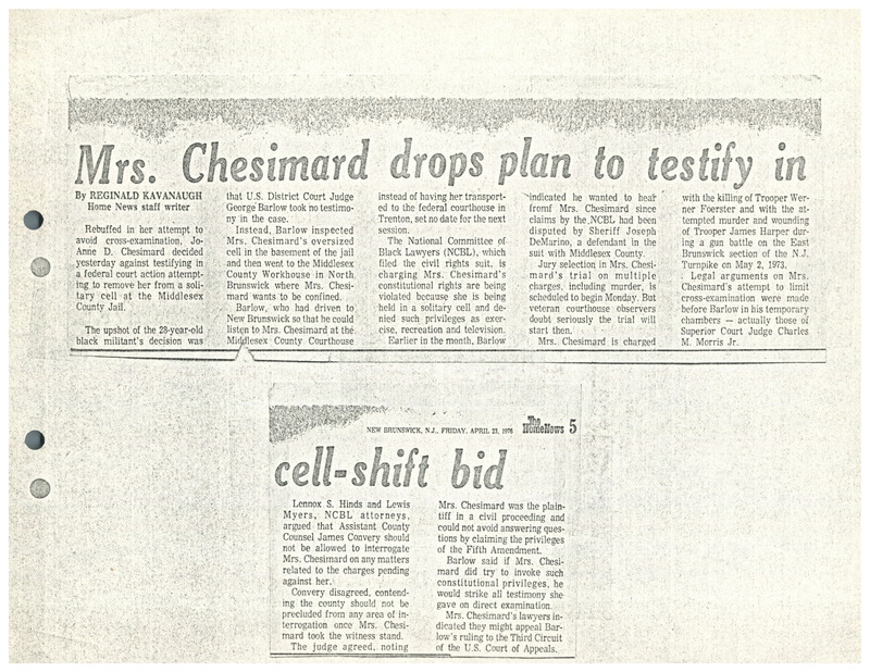 A newspaper article from The Home News about Assata Shakur (JoAnne Chesimard) dropping her plan to testify in her attempt to get moved to a larger cell while in Middlesex County to stand trial for the May 1973 killing of a state trooper. Shakur was convicted in 1977 of the killing and escaped prison in 1979.