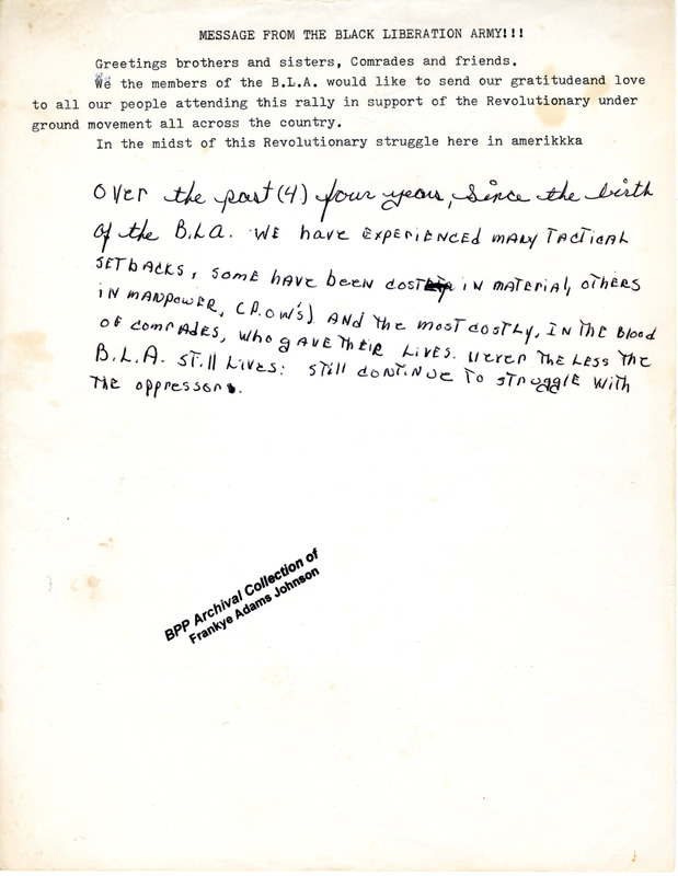 Brief greetings given on behalf of the Black Liberation Army (BLA) to people attending a rally in support of revolution. With handwritten notes by Frankye Adams-Johnson (Malika) about some of the tactical setbacks the BLA has experienced, the most costly of which being the loss of people who gave their lives to the struggle.