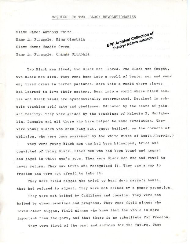 A requiem written to Anthony White (Kimu Olugbala) and Woodie Green (Changa Olugbala), two members of the Black Liberation Army (BLA) who died in prison. The author writes that their memory will be used as fuel for the ongoing struggle against oppression. A quote from Argentine Marxist revolutionary Che Guevara is printed at the bottom of page 2.