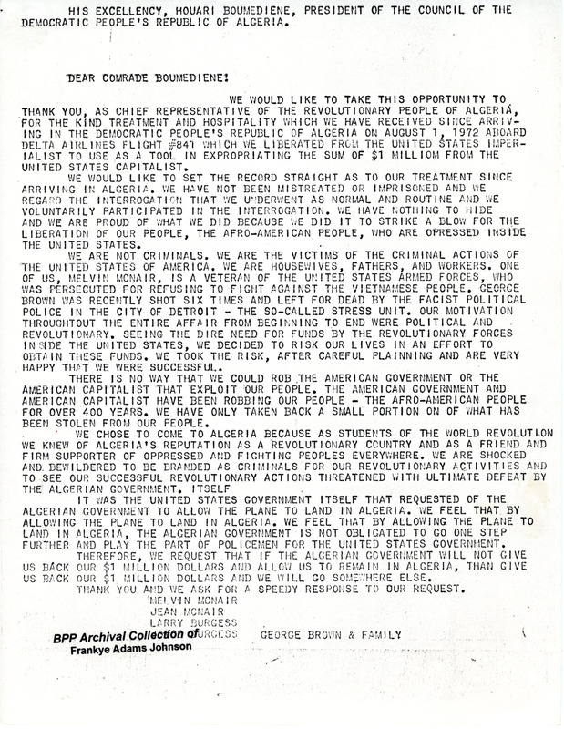 A letter to Algerian president Houari Boumediene from members of the Black Liberation Army (BLA) who had fled to his country from the United States. Melvin McNair, Jean McNair, Larry Burgess, and George Brown hijacked a plane in Miami on July 31, 1972 to seek political asylum in Algeria. The letter talks about their treatment in the country.