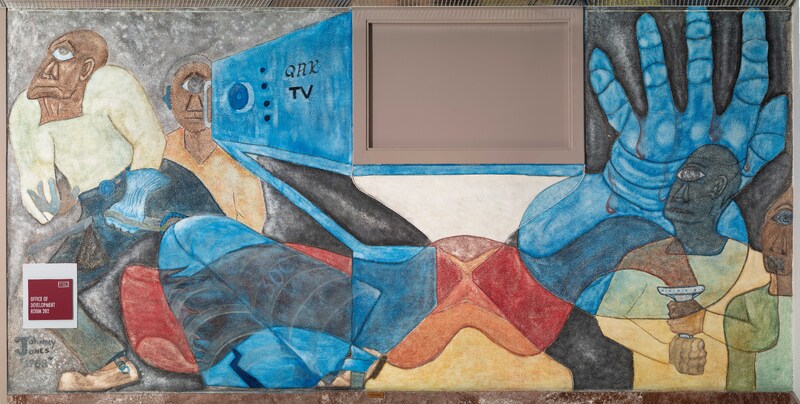 Jones’ surrealistic mural depicts bald, cyclops-like men conducting a television broadcast. Jones incorporated architecture into the design by using a window, since painted over, as the camera’s lens. A man beneath the camera carries a torch with a strong, flowing flame.