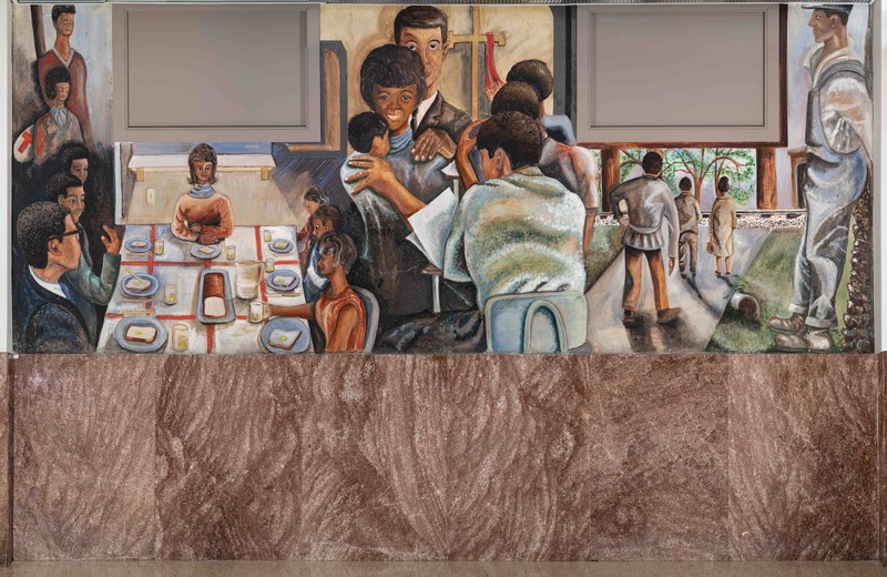 Mass depicts scenes of family life, including a gathering at the dinner table and church services. The laborer at the far right suggests the role of physical work in sustaining the Black family. As in other murals, architectural elements from Hannah Hall are incorporated in this mural.