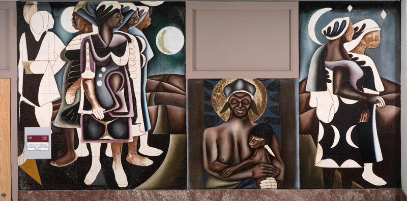 Cleinmann’s mural displays multiple generations of Black women, a manifestation of Biggers’ teachings about their importance. The mural is one of the few unfinished murals in Hannah Hall. Typically, unfinished murals were painted over. The mural was recently restored by conservators.