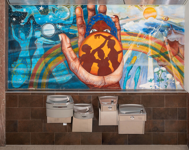 Burley’s vibrant mural explores cycles of life and focuses on women. The left conveys night and includes a female constellation. The right shows daytime, with plants and animals. A rainbow runs across, signifying unity. The large, detailed hand is a frequent motif in the art of Biggers’ students.