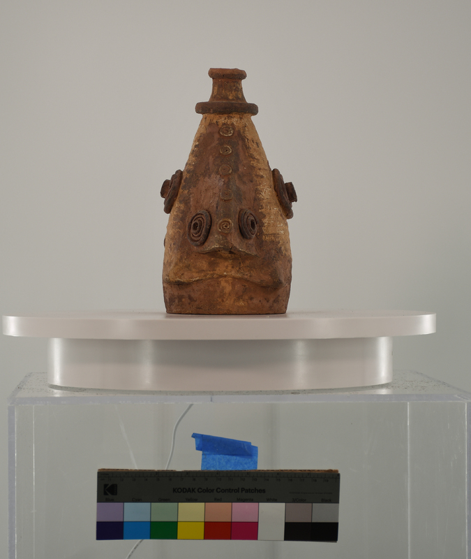 “Shrine,” by Curtis Watson Jr., features a duck-like creature surrounded by various embellishments, including spirals, a commonly used visual motif in the student terracottas. Unfortunately, the head of the figure is missing, leaving only the body in view. The full sculpture can be seen in archival photos shot by Dr. John T. Biggers of the artist at work.