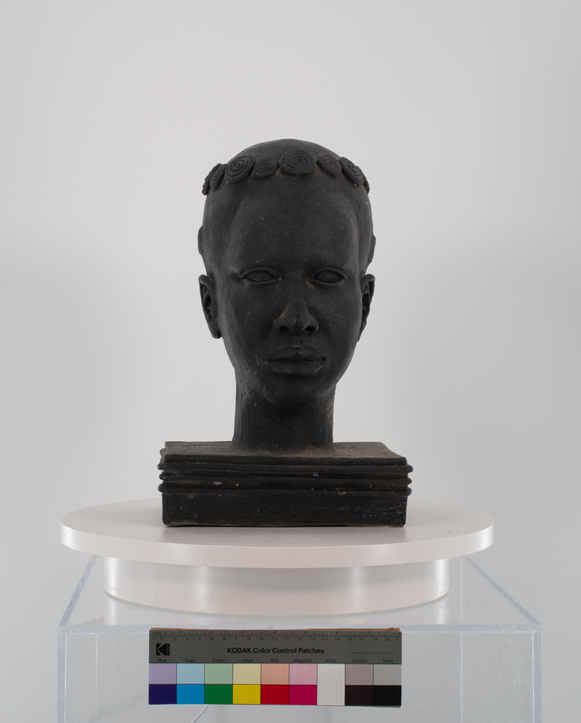 This unknown student’s bust was created during their time as an art student at TSU. Under the instruction of Professor Carroll Harris Simms, artists would create self-portraits embellished with decorations like spirals and accentuated crown pieces, like in this sculpture. These busts are inspired by Nok terracotta sculptures and Ife busts, which Simms saw during his travels to Western Africa. This bust is different from others due to its black ceramic and large rectangular base.