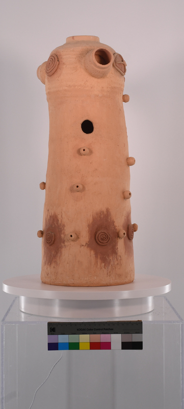Elizabeth Montgomery Shelton’s terracotta is made up of a variety of colored clays with embellishments that have been painted using black and tan slips. The top half includes layers of plates extending out from the surface, while the bottom half is evenly decorated with pressed circular clay. The structure perhaps mimics an instrument or a bird feeder.