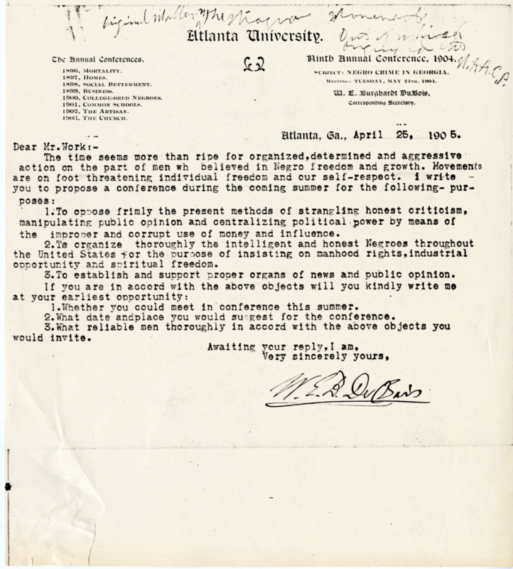 One-page letter from Dr. W.E.B. DuBois to Monroe Work asking him to attend a conference in the coming summer to discuss methods of uplifting the black community. The Niagara Movement and N.A.A.C.P. are written on top of the letter.