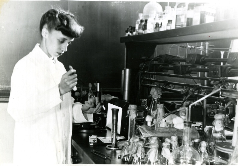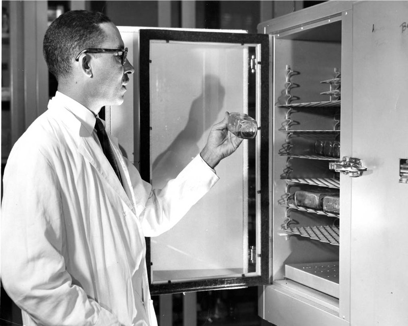 A black and white photo Dr. Russell W. Brown working in a lab. Dr. Brown worked in a variety of roles in Tuskegee's administration, serving twice as Director of the Carver Research Foundation. During his career, Brown worked extensively in research on bacteriology, immunology, and HeLa cells.
