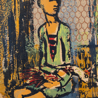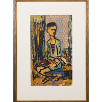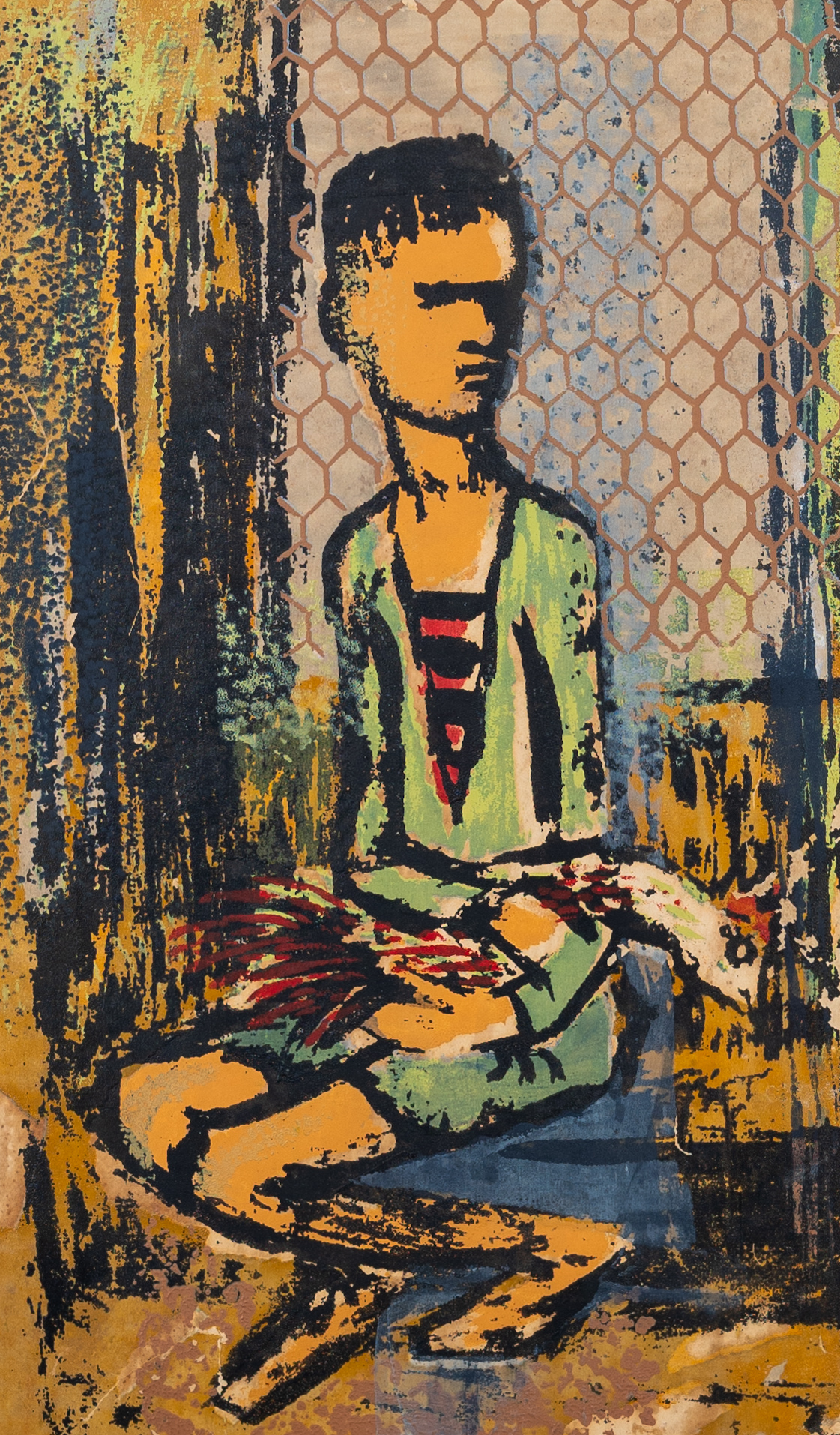 Howard E. Lewis was an Art professor and Korean War veteran from Columbus, OH. Boy with Pet depicts a young man sitting outside with a domesticated chicken. The bird rests in his lap as it sits along a curb in front of a chain link fence.