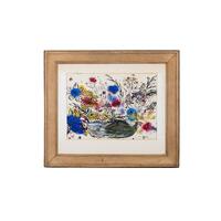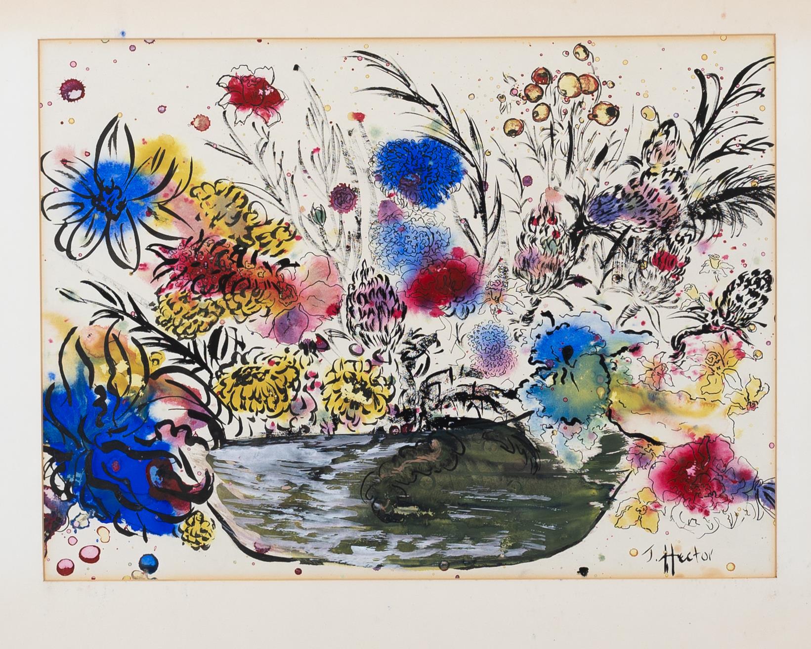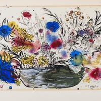 June Hector was an artist from Atlanta, GA. Wild Flowers displays a landscape of flowers in multiple colors and plant organisms all surrounding a small body of water. The colors blue, red, yellow, and purple are layered throughout the painting.