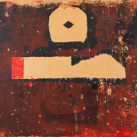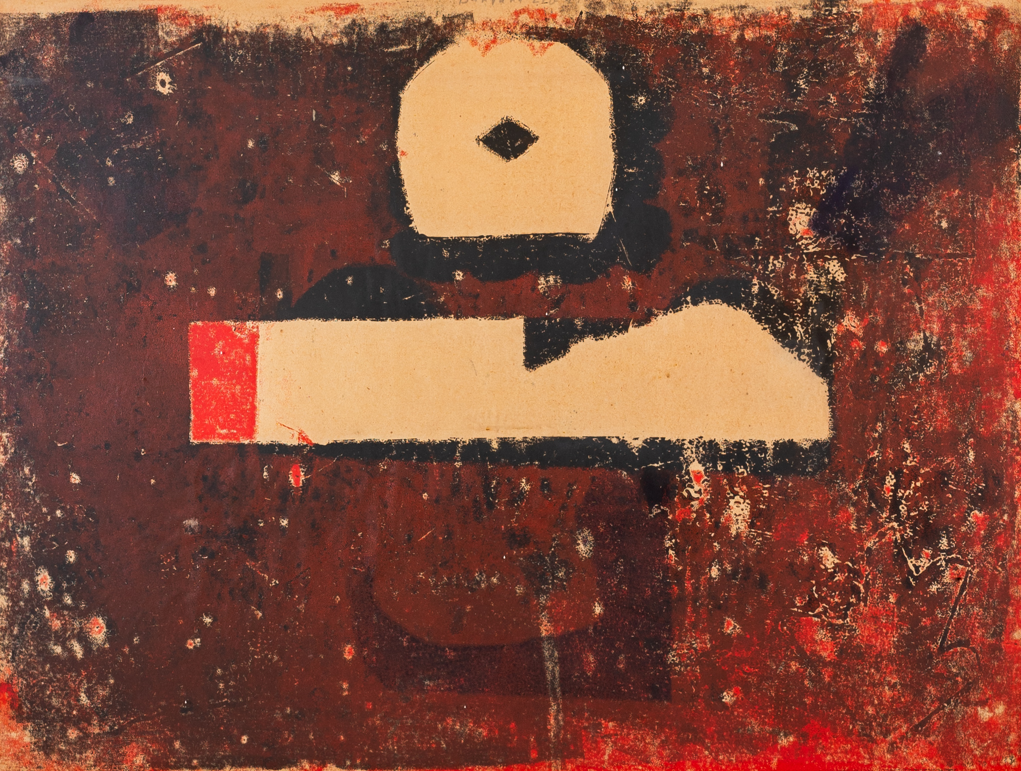 Barbara L. Gallon was an artist from Tallahassee, FL. Abstraction is a depiction of two main shape forms painted in a light tan, paired with a bright red square in the left. They are boarded by black paint and layered on a surface of dark red, brown, black, and tan.