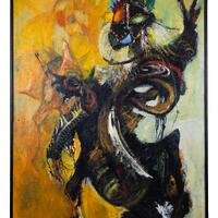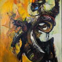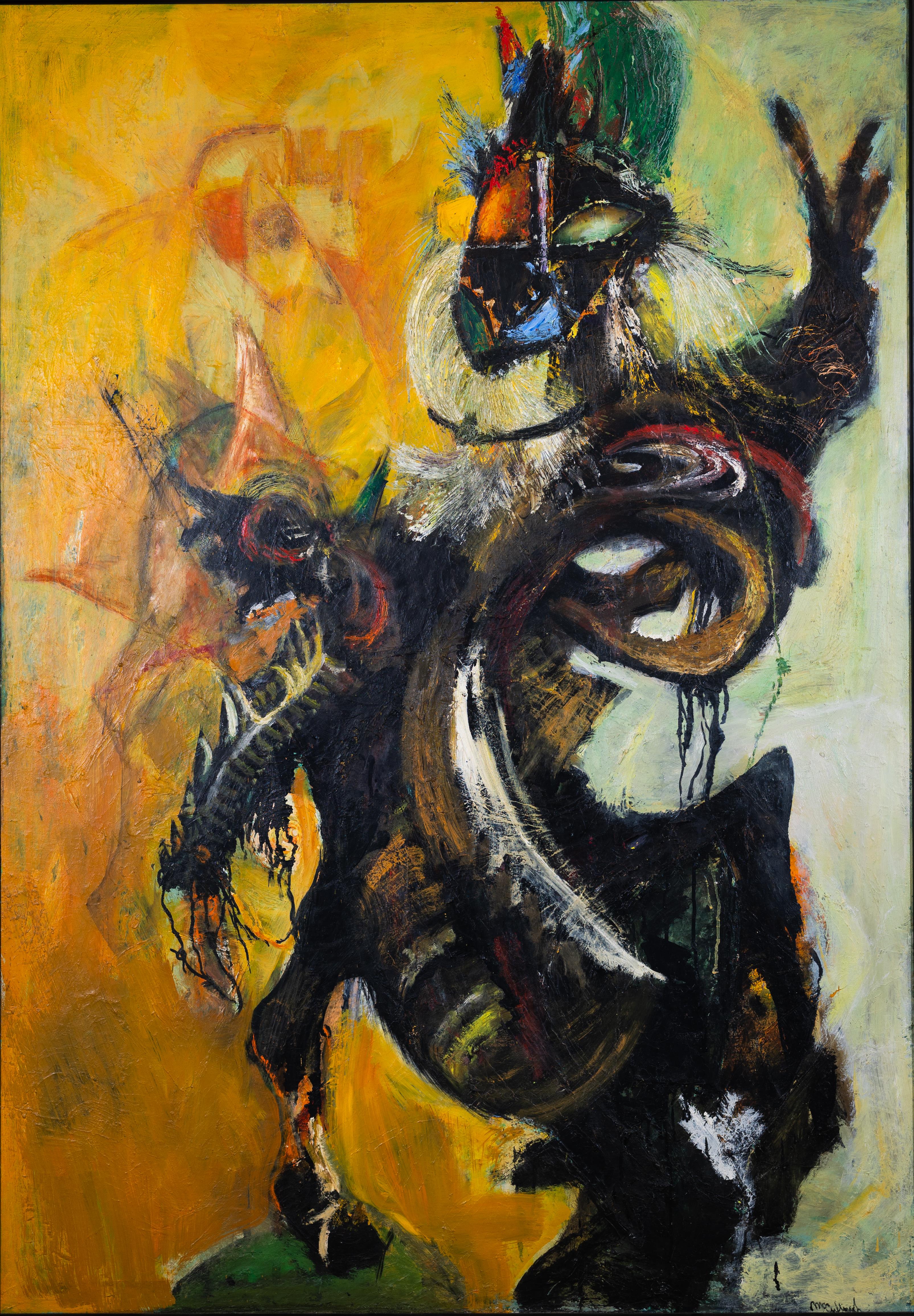 Geraldine McCullough was a renowned painter and sculptor from Kingston, AR. The Black Knight depicts an abstract figure riding a creature like a horse. The figure is primarily black, with a twisted torso, and has masquerade-like attributes. The creature is predominantly black, with both ominous and mythical characteristics.