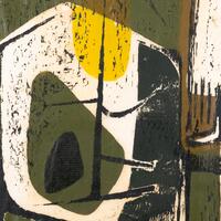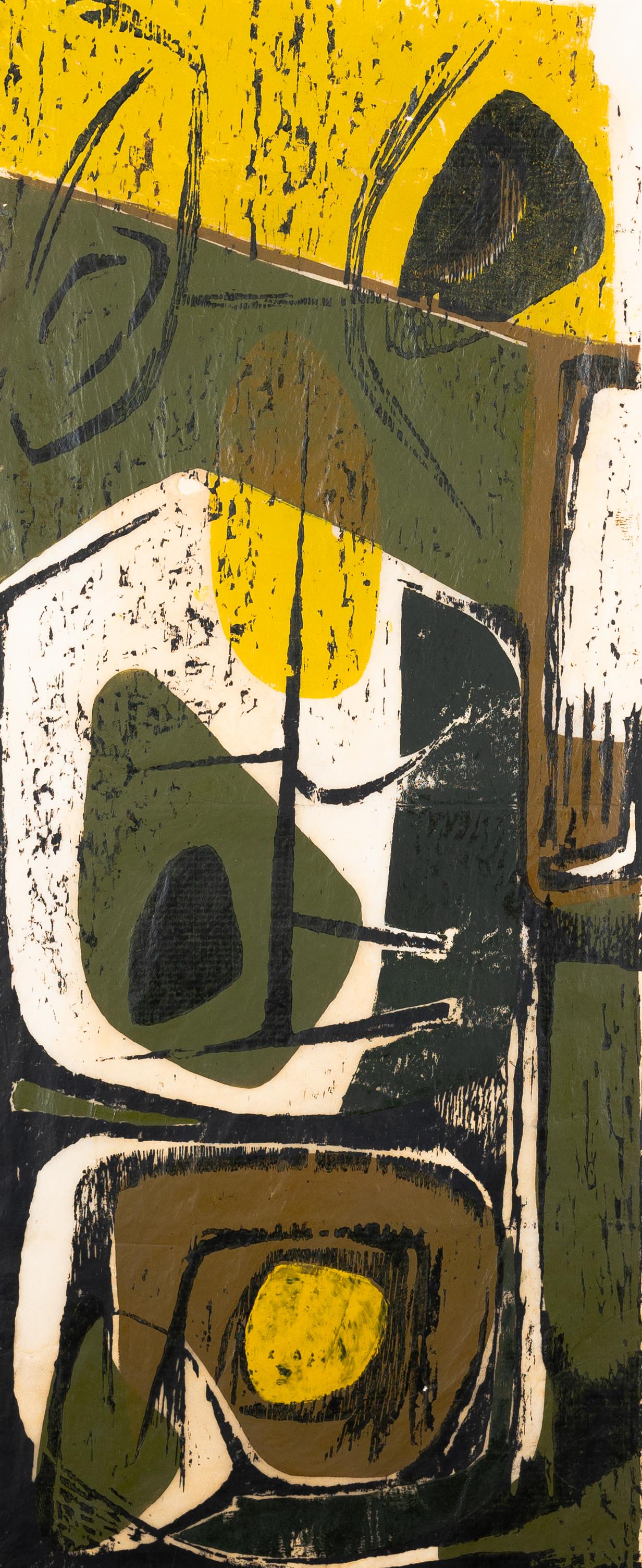 Harper T. Phillips was an artist from Courtland, AL. The Ant is a painting with numerous geometric forms and lines in a vertical composition. Each white, yellow, green, and black shape lay in pocketed areas overlapping black borders and lines.