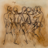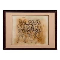 William V. Harper was an artist and art educator from Cayuga, Ontario, Canada. Group Study #1 is a gestural drawing focusing on several human figures' physical composition. Lines of body parts overlap, and each figure moves in different positions and directions.