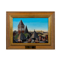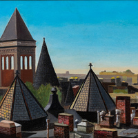 Edward Strickland was an artist, educator, and writer who lived in New York City. Brooklyn View depicts the rooftop perspective of a neighborhood in Brooklyn, NY. Several buildings with chimneys and spires are in the foreground, and the cityscape continues in the background.