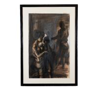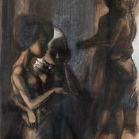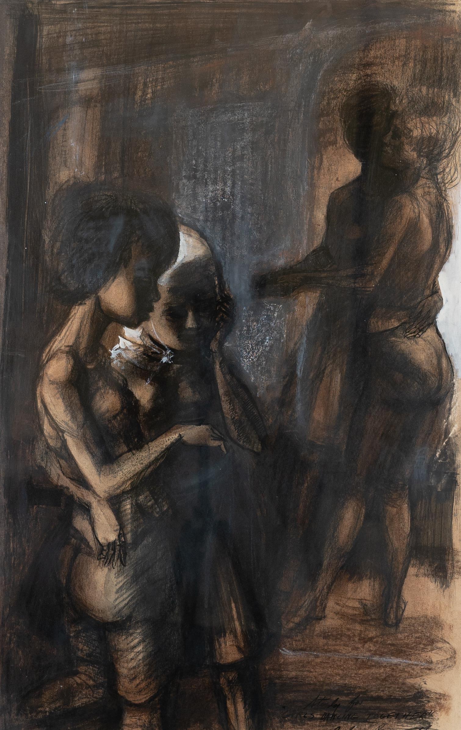 Calvin Burnett was a graphic artist, illustrator, painter, designer, and art teacher from Cambridge, MA. Four Girls Dancing Together depicts two young girls and two adolescent girls dancing in one room. Their faces wear a sorrowful expression. Their nude, shadowy bodies stand together in pairs as they sway, caressing each other.