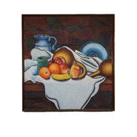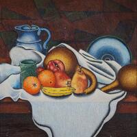 Alfa Bell was an artist from Montgomery, AL. Still Life with Fruit is an abstracted print of inanimate kitchen objects with an abstracted background. The piece features a cup, pieces of fruit, and gourds on top of a white sheet in front of a water pitcher and a plate.
