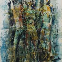 William S. Carter was an abstract, landscape, still-life, and figurative painter from St. Louis, Missouri. Three Women (figures) depicts three nude women drawn over muted watercolors. The women maintain a confident pose that separates them from their abstract background.