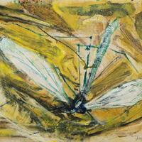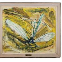Calvin Burnett was a graphic artist, illustrator, painter, designer, and art teacher from Cambridge, MA. Insect is a painting of a dragonfly in a close-up perspective. The dragonfly is primarily bright green with long, thin legs, two white wings, and a dark blue head. A naturalistic setting of bright yellows, browns, and greens surrounds it.