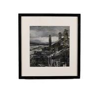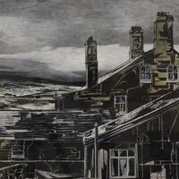 Norma Morgan was a painter from New Haven, Connecticut. Ghost Light shows a house and a shed that sit in the close foreground. Their wooden structures are cast in heavy shadow. There is an atmospheric background remaining with a gloomy color palette of gray, black, and white.