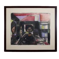 Calvin Burnett was a graphic artist, illustrator, painter, designer, and art teacher from Cambridge, MA. The Box is a surrealist drawing of a Black woman seated in a box. The drawing's geometric complexity and the woman's reflections evoke an uncanny feeling.