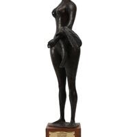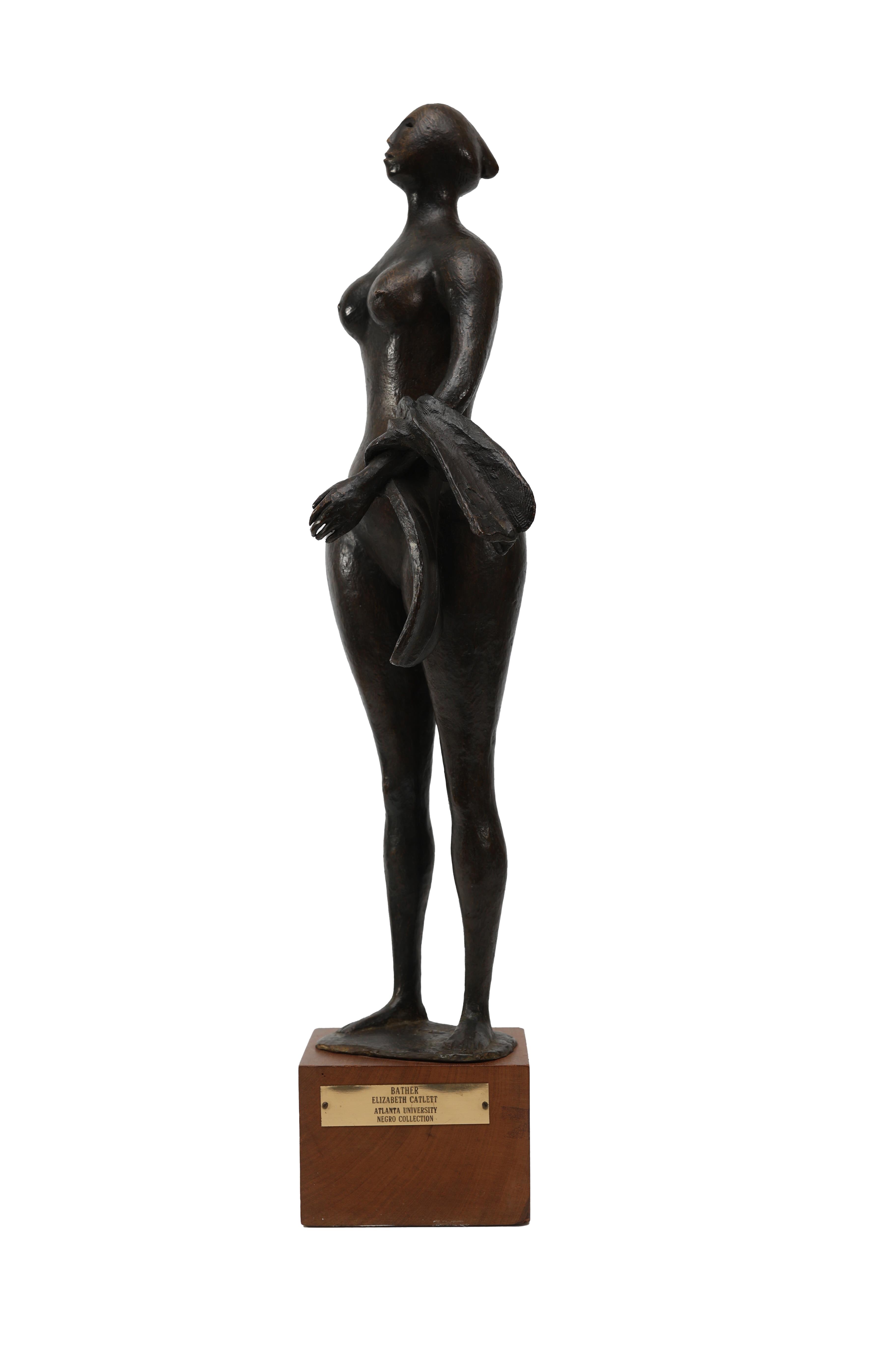 Elizabeth Catlett was an artist and educator from Washington, D.C., who repatriated to Mexico. Bather is a bronze sculpture of a woman preparing to bathe. The subject is nude, standing with their head held high with a towel hanging from their arm.