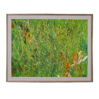 Gilbert H. Hatcher was a painter from Augusta, GA. Spring Folic is an abstract painting with a green background. The color palette includes hues of yellow, red, orange, green, white, and black. Gestural strokes of paint are layered to create a feeling of nature and springtime.