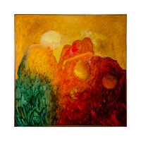 James Adair was an artist from Atlanta, GA. A prayer Meeting is an abstract depiction of a group of people practicing a religious ritual. Adair uses broad brush strokes of green, red, and yellow to create this scene of piety.