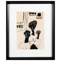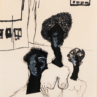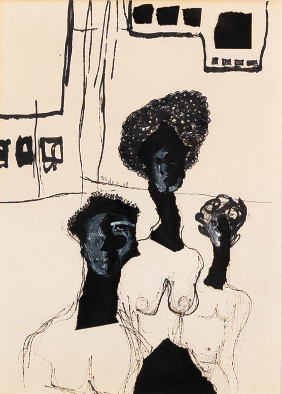 Freddie Styles was an abstract painter and collage artist from Madison, Georgia. Untitled is an ink painting of three women with elongated necks, curled hair, and black-painted skin. Their faces are partially concealed as they stare straight ahead. Their torsos are white, with exposed breasts outlined in black ink.