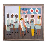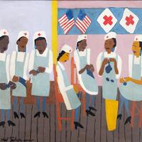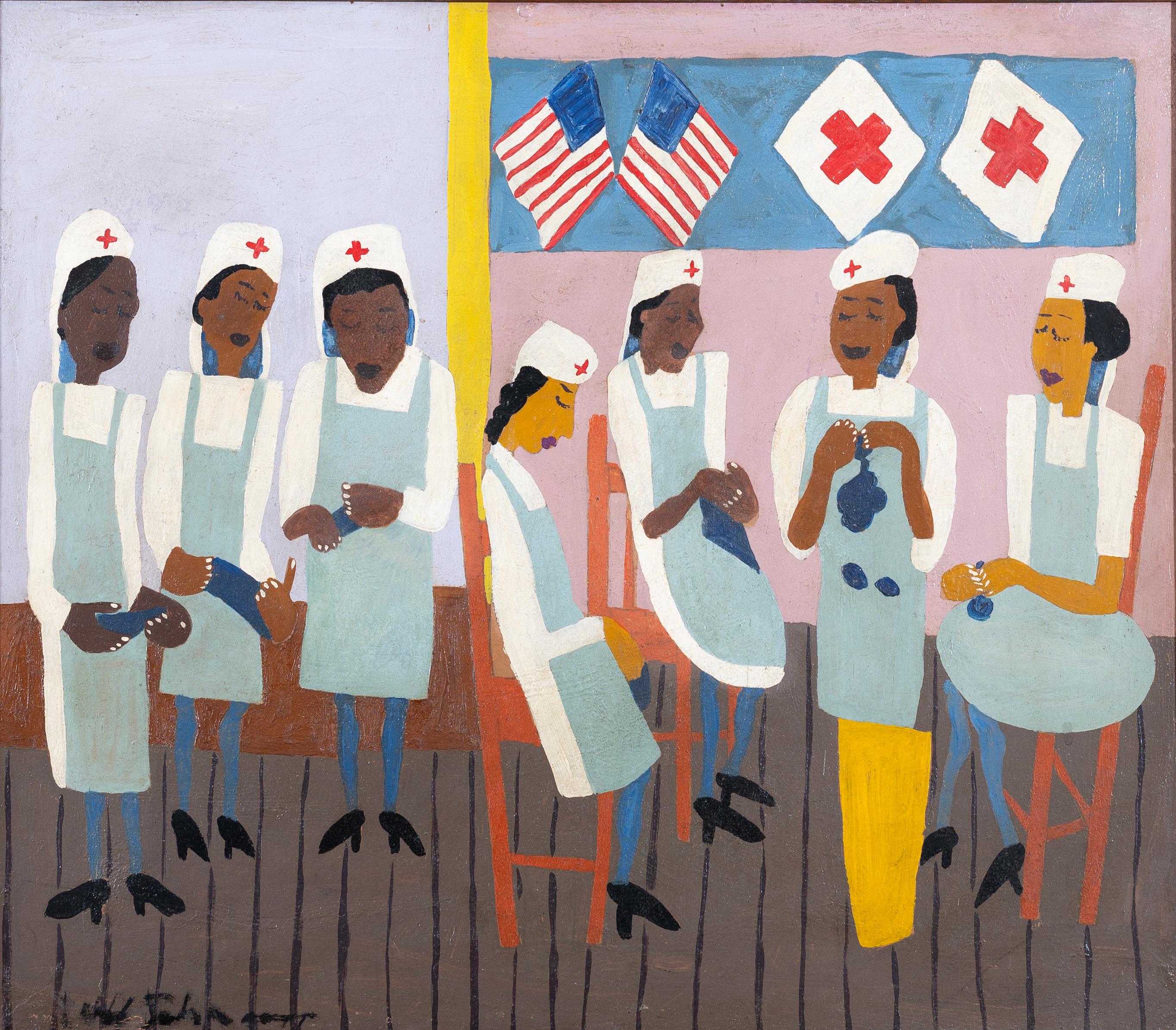 William H. Johnson was a painter from Florence, SC. Red Cross Knitting Center depicts seven Black women in lab coats and aprons. The women are knitting in support of the Red Cross' relief efforts. The Red Cross began knitting campaigns in 1917 during World War I.