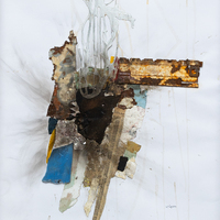 Wilay Mendez Paez is an Afro-Cuban sculptor and collage artist. Guia Eliptica, 2018, is a mixed-media collage piece compiled with found objects. Wilay completed it during an Artist Residency at Clark Atlanta University Art Museum, where the museum's permanent collection inspired him.