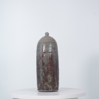 Simms’ ceramic vessel is round and stout, with ridges and a node at the top, and has a maroon and gray glaze. Carroll Harris Simms worked alongside Dr. John T. Biggers to establish the Texas Southern University Art Department. Simms taught sculpture, ceramics, and jewelry-making classes.