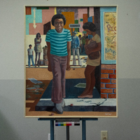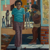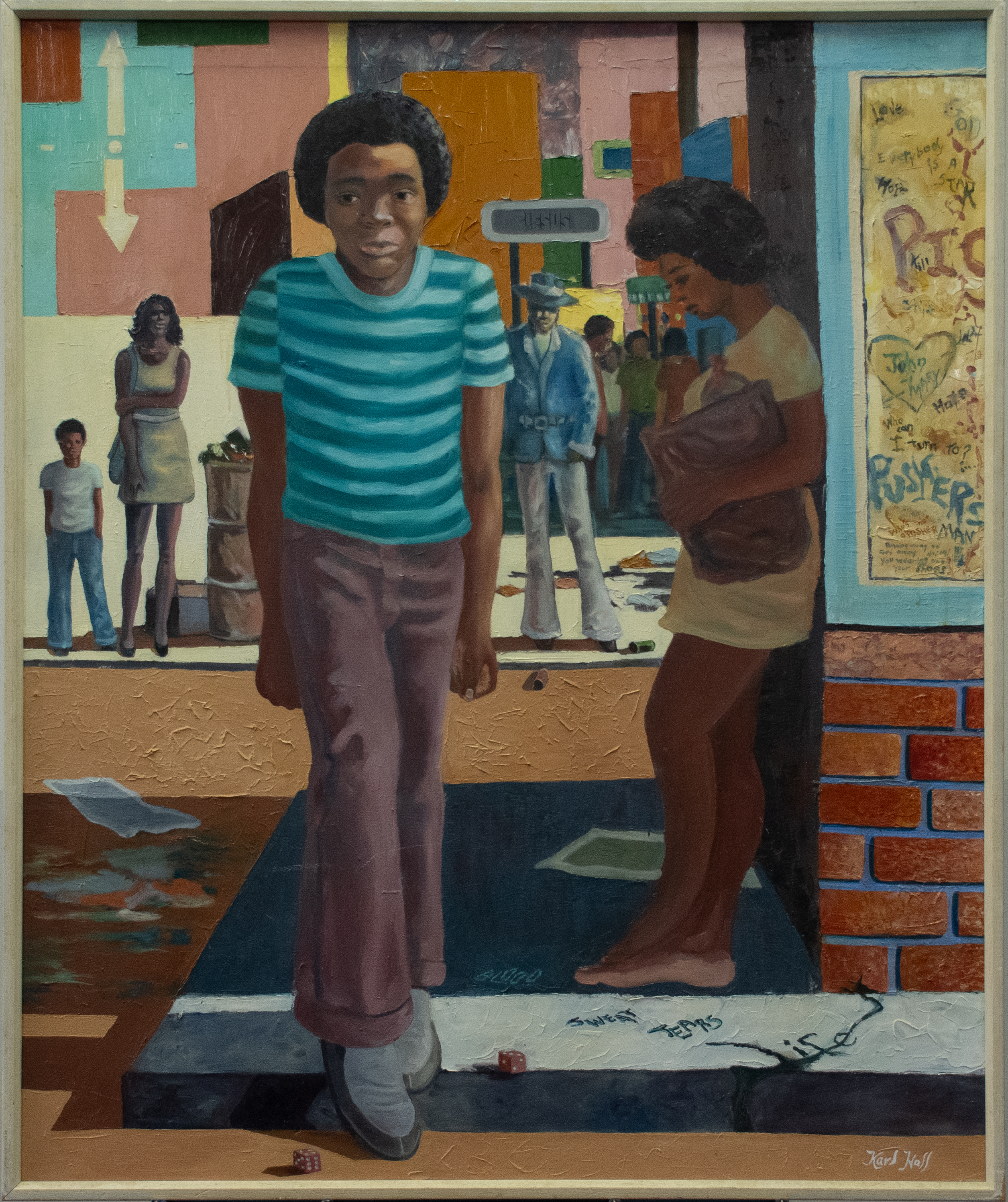 Hall's colorful painting highlights the view of a busy street corner. The main figure walks through the scene with tense shoulders and a balled fist, with a crowd of people lining the background. Graffiti, dice, and litter are seen on the street, sidewalk, and walls. This may be a depiction of Hall’s experiences growing up in Sunnyside, a historically Black neighborhood in southeast Houston.