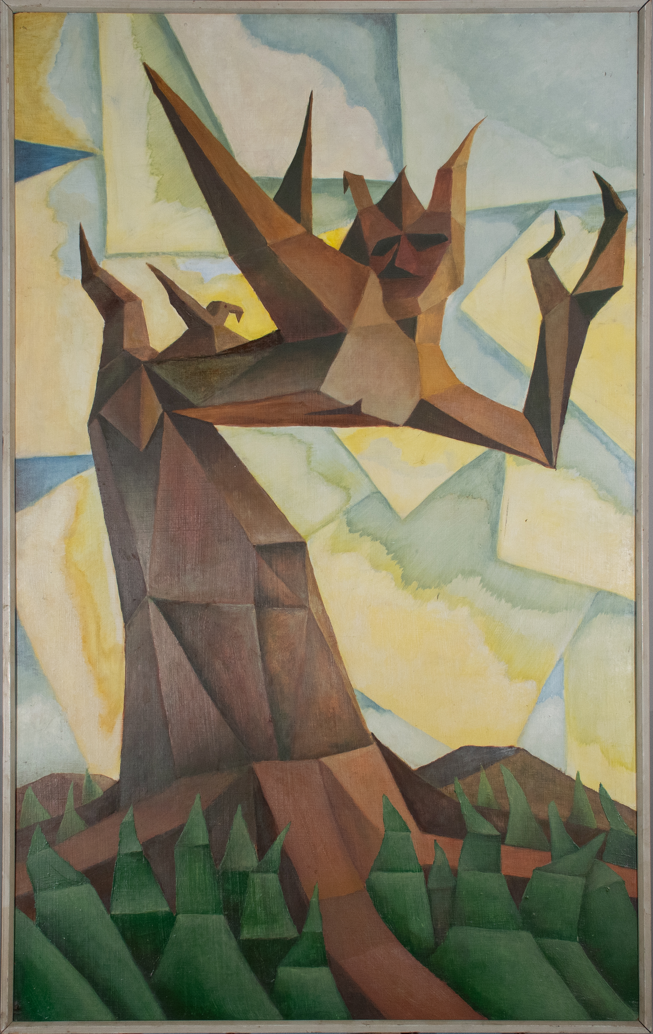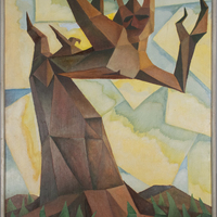 Sifuentes' painting shows a landscape filled with grass and a barren tree, with a bird perched atop. The tree bears human characteristics, perhaps symbolizing the interconnectedness of all living beings. This piece is painted in a geometric style that appears frequently in the work of students of Dr. John T. Biggers during the mid to late 1970s. Sifuentes later went on to become an art professor at Texas Southern.