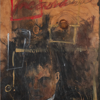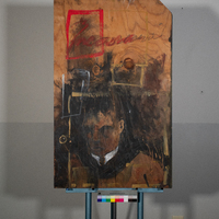 Pruitt’s painting is based on a photo he took of the preacher of his childhood church. At the time this piece was painted, the artist was exploring different faiths and struggling with his religious beliefs. Pruitt cites Basquiat and Rauschenberg as stylistic inspirations that influenced this painting. The muddied brushstrokes used to create this piece reflect the internal struggle of the artist.